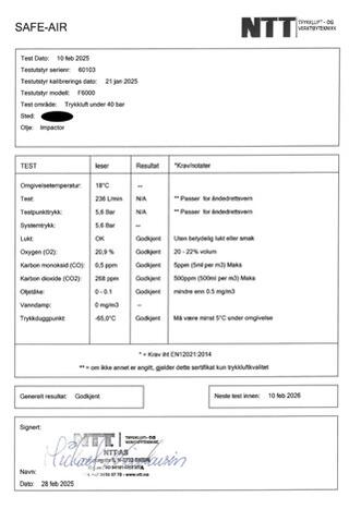 Vi selger utstyr for å la kunden selv overvåke trykkluftkvaliteten internt med alarm utveksling. NTT AS utfører analyse av pusteluftkvalitet fra trykkluftanlegg, Vi sjekker at luftkvaliteten er i henhold til kravene i NS-EN 12021.